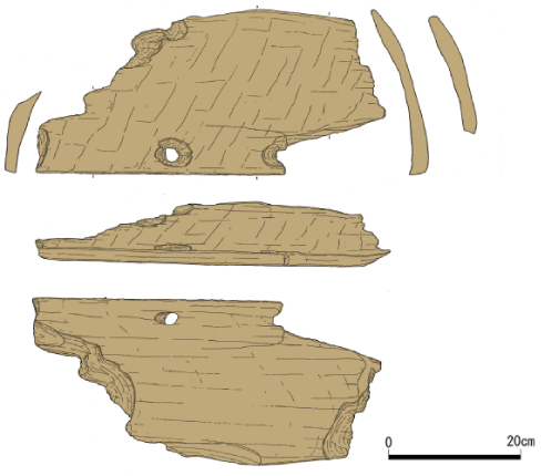厚さが3cm近くあり、内面に石斧による削り痕がみられます。また内面から外へ向って連続した穴が開けられています。
