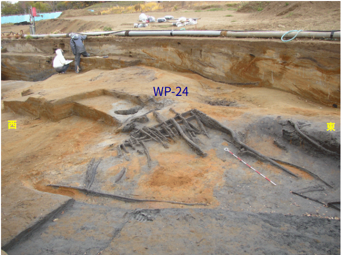 WP-23は左岸側の支柱の大部分が未発掘ですが、中心に開口部があり、支柱が上流にむかいV字形に開く支柱配列がされています。WP-24は支柱と「柵」が倒れているのが見えます。