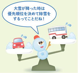 - 幹線道路は、優先度の高いバス通りなどの重要路線の除雪を実施します。